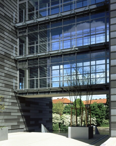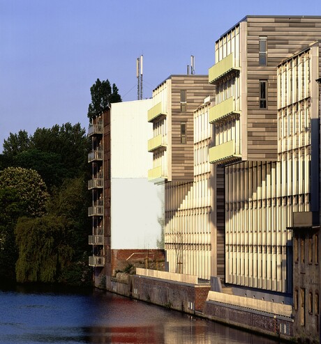 Am Alten Teichweg stehen der dreigeschossige Altbau und ein ebenfalls dreigeschossiger Neubau. Über eine Zufahrt zwischen diesen beiden Gebäuden gelangt man zum Gewerbehof, der von zwei vier- bis sechsgeschossigen T-förmigen Bauten begrenzt wird. Von dort führt ein Durchgang zur Uferpromenade am Osterbekkanal. Die Fassaden an der Hofseite sind mit Fensterbändern und farbiger Blechverkleidung versehen. Zum Kanal und zur Straße hin bieten geschoßhohe Glasfassaden einen freien Blick.