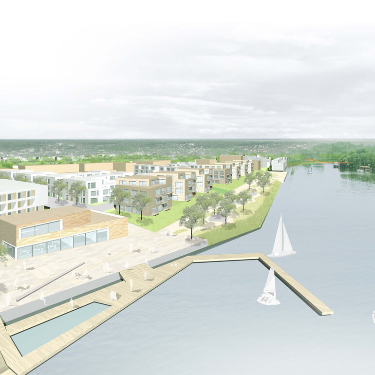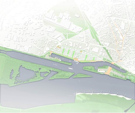 GeesthachtEntwurfsziel ist die Schaffung eines lebendigen Stadtquartiers, der „Geesthachter Wasserstadt“, mit hohen Nutzungs- und Wohnqualitäten. Es wird eine robuste kleinteilige Grundstruktur vorgeschlagen, welche sich in acht Abschnitten entwickeln lässt. Der Entwurf integriert die bestehende Parzellenteilung in ein neues Netz aus Baufeldern und Wegebeziehungen. Dabei wird der Wohnnutzung als stadtbildende Funktion eine Präferenz eingeräumt. Eine übergeordnete Verbindung bilden die neu gefassten Hafenbereiche, welche durch Begrünung und funktionale Aktivierung zur spannungsvollen Klammer zwischen Stadt und Wasser umfunktioniert werden.