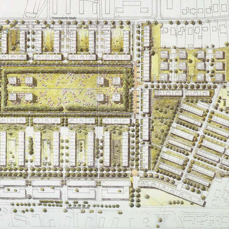 Hamburg - OldenfeldeKonversion der ehemaligen Boehn-Kaserne, weitgehender Abriß des Baubestandes. Entwicklung eines verkehrsberuhigten Wohnquartiers mit vielfäligen Haus- und Wohnformen, kleines Versorgungszentrum an der Scharbeutzer Straße (Marktplatz), sowie einer Grundschule und 2 Kindertagesstätten.