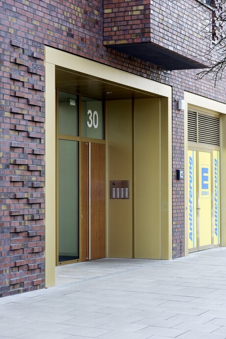 Gestalterisch bezieht sich das Gebäude mit einer fein differenzierten Klinkerfassade auf die 20er Jahre-Klinkerarchitektur des angrenzenden Quartiers und des „Klinker“-Turmes auf der anderen Seite der Hochbahnlinie.
