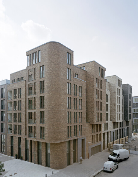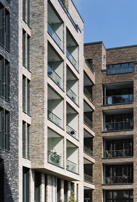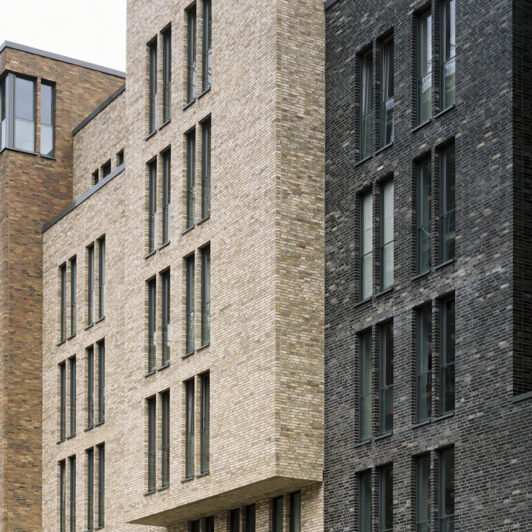 Die Entwurfsidee visiert ein Spektrum bestimmter Material- und Detailentscheidungen. Die Eigenständigkeit der einzelnen Häuser im Ensemble mit Ihren leichten Farbnuancen. Die entschiedene Zurückhaltung der reliefartig geschichteten Backsteinhaut. Die präzise Formulierung der Fassadenöffnungen mit dünnen Backsteinpfeilern und dahinter gelegten Fensterrahmen. Die besonders eingefassten Loggien mit ihren rahmenlosen Glasbrüstungen und Glasschiebeelementen.