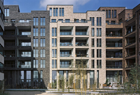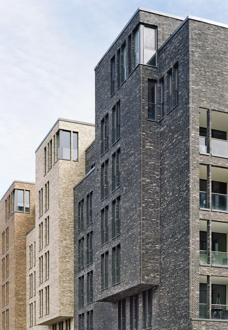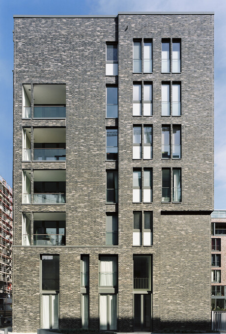 Hamburg - HafenCityGliederung des 7-geschossigen Baukörpers mit 44 Wohnungen in ablesbare speicherartige Mehrfamilienhäuser.