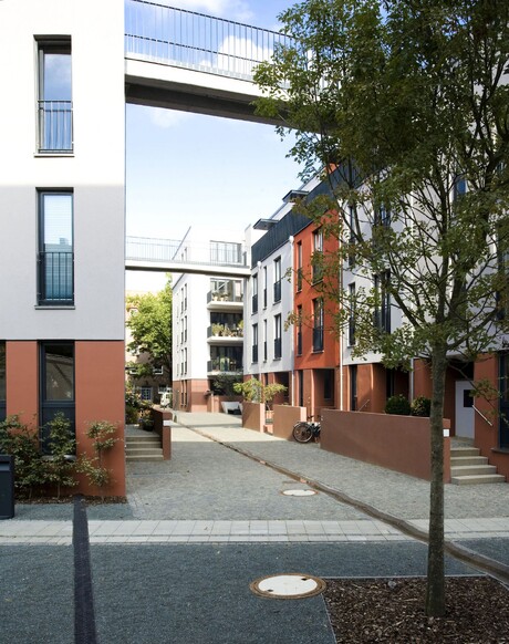 Das Bebauungskonzept spielt mit dem Thema der Terrassenbebauung, welches besondere Wohnlagen im Blockinneren erschließt. Gestapelte Maisonetten mit alternativ eigenem Garten oder großzügiger Dachterrasse schaffen individuelle Adressen für Familien. Über zwei Erschließungsgassen wird ein hochwertiges Wohnrefugium erschlossen, welches hohe Dichte mit gut nutzbaren privaten und gemeinschaftlichen Freiräumen kombiniert. Die zweigeschossig betonten Eingänge im Blockrand schaffen hingegen hochwertige Adressen im grün-urbanen Umfeld. Durchgesteckte Wohnungen garantieren eine gute Belichtung und flexible Nutzung für ihre Bewohner. Ein gemeinschaftlicher Spiel- und Freizeitbereich verbindet das Ensemble mit den genossenschaftlichen Wohnungen im Süden.
