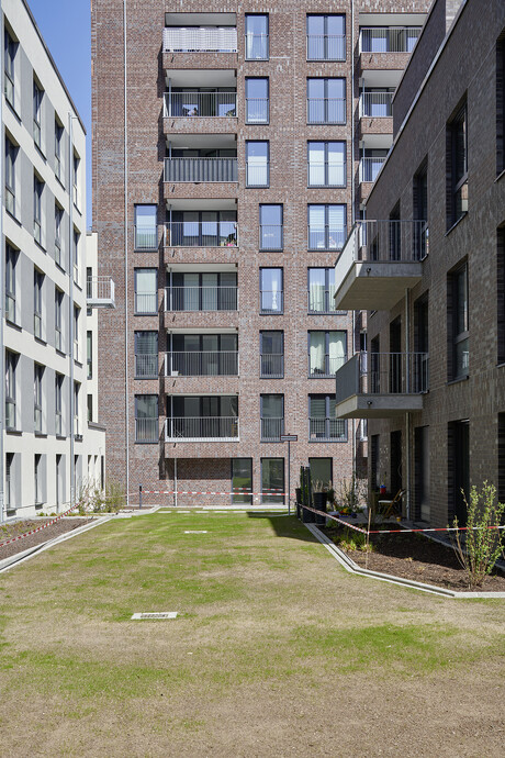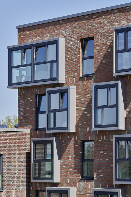 Der B-Plan forderte eine Verblendfassade für die straßenseitigen Fassaden, im Innenhof sind Putz- und Holzfassaden vorgesehen.