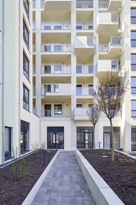 Der B-Plan forderte eine Verblendfassade für die straßenseitigen Fassaden, im Innenhof sind Putz- und Holzfassaden vorgesehen.